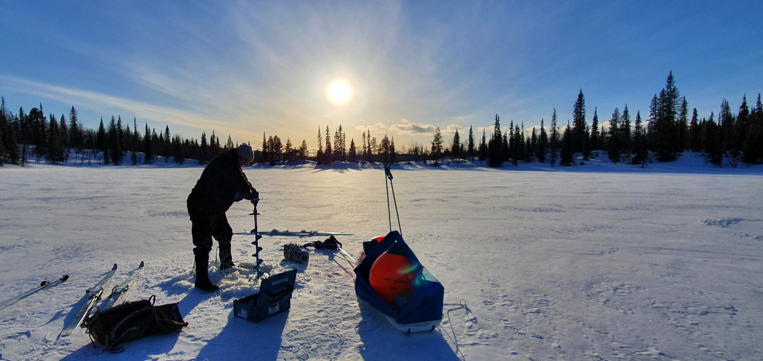 Seuraavat päivät menevät lisää termistoriketjuja rakennellessa ja ahkiota kiskoessa pitkin Pallaksen maisemia. Välillä yksin ja välillä Juha lähtee hiihtokaveriksi. Tuntuu, että nythän hommat menee putkeen. Toiseksi viimeisellä järvellä kuitenkin tapahtuu. Juuri kun saan reiän valmiiksi ja vedän kairan ylös, se irtoaa Makitan istukasta ja valuu syvyyksiin. Jäädyn totaalisesti ja katson vain, kun se katoaa ulottumattomiin. Peeveli. Ei auta itku. Soitan heti puheluita ympäri Muoniota ja uusi kaira löytyy. Käyn hakemassa sen seuraavana päivänä ja pääsen vielä viimeiselle järvelle.